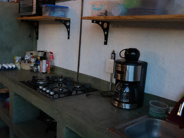 La habitación doble incluye una pequeña cocina equipada con nevera y utensilios de cocina, lo que permite preparar y guardar alimentos. También ofrece tetera y cafetera, zona de estar, baño privado con ducha y terraza con vistas al jardín. La habitación cuenta con una cama.