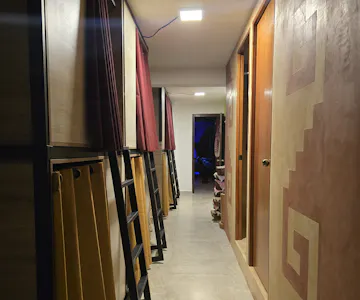 A la entrada de la habitación se encuentran las Callis: ocho cápsulas individuales en una habitación mixta, acogedoras y diseñadas para el descanso y la privacidad. El espacio cuenta con regaderas y baños secos de uso exclusivo para esta habitación, funcionales y pensados para un uso más consciente y responsable de los recursos.